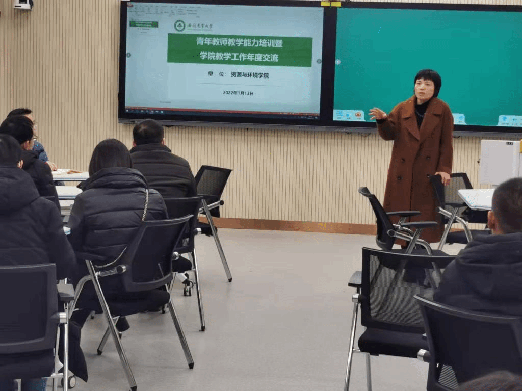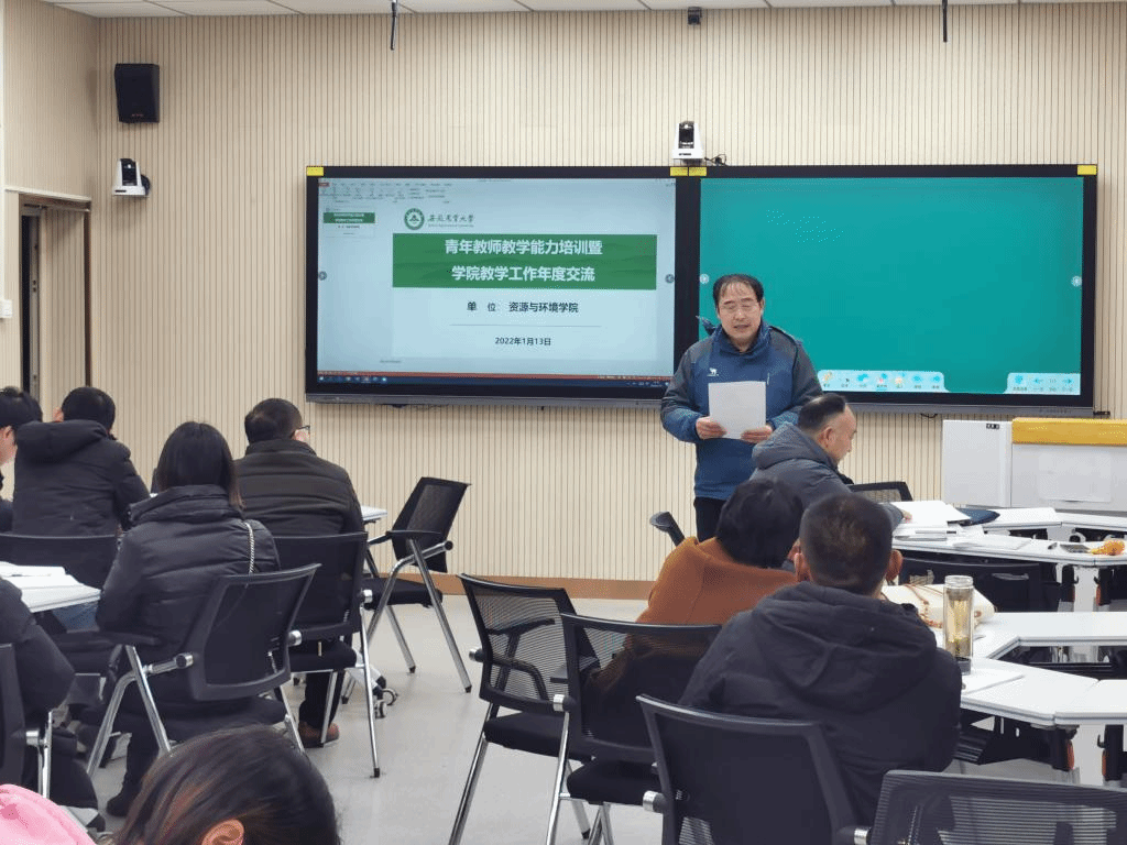 本网讯 1月13日下午,资源与环境学院召开教学工作交流会。学院党委书记王琼,党委副书记、纪委书记、副院长姚洪章,学院教学督导老师、各系部主任、副主任,教学秘书,2019年以来入职的青年教师参加了交流会。为了更好地引导广大教师积极开展课程建设,本次会议在智慧教室进行。会议由学院副院长张震主持。