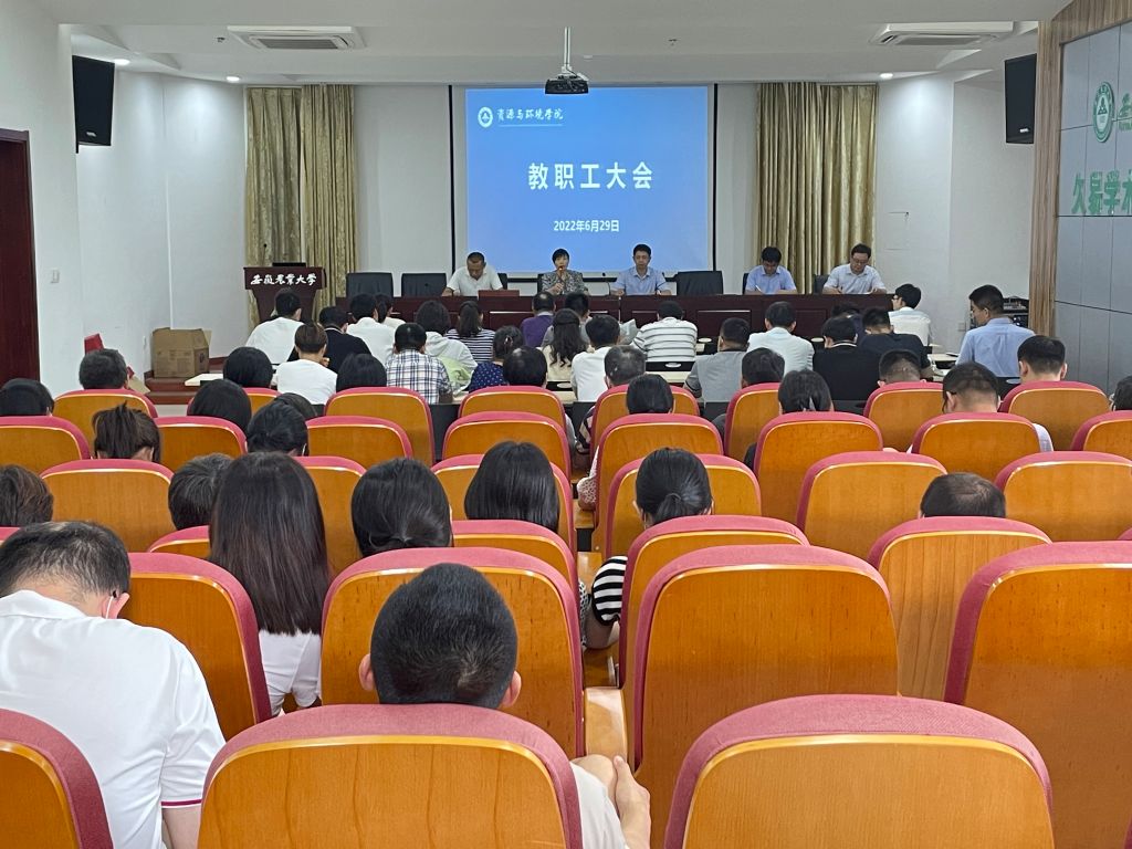 本网讯 6月29日下午,资源与环境学院于中西部大楼南楼久易学术报告厅召开全院教职工大会,部署推动重点工作。学院党政领导、全体教职工参会,会议由学院党委书记王琼主持。