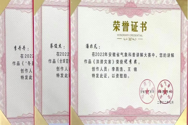 大赛自今年3月底启动以来,得到地市气象局、安徽农网、高校、中小学等单位的积极参与。我校资源与环境学院气象专业学生和校气象爱好者协会组织3支参赛队伍,以极端天气作为切入点,不断凝练主题内容、精进表达能力、改善整体形象,经过3个多月的比拼,最终斩获优秀奖3项,同时安徽农业大学获评“优秀组织奖”。