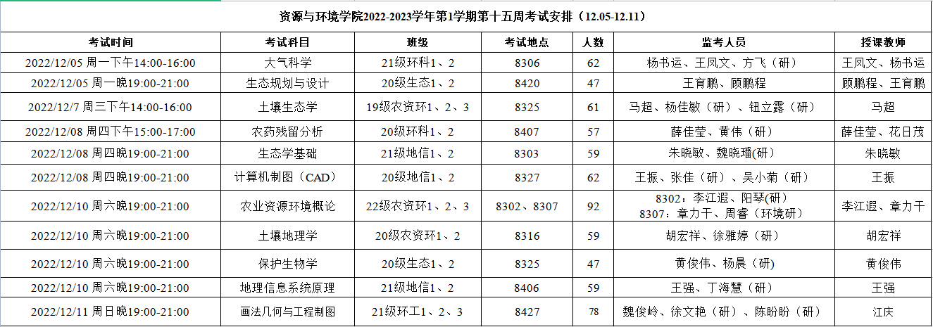 通 知 | 资源与环境学院2022-2023学年第1学期第十五周考试安排