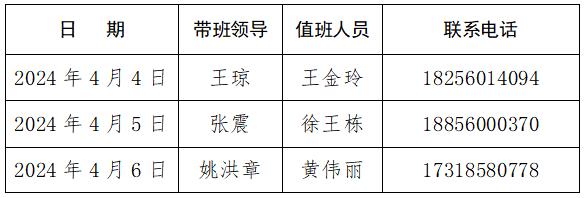 根据学校2024年清明放假安排,放假期间,为确保各教研室、实验室、办公室的安全,做好防火、防盗等安全工作,学院安排值班人员如下,要求值班人员认真履行职责,按时值班。