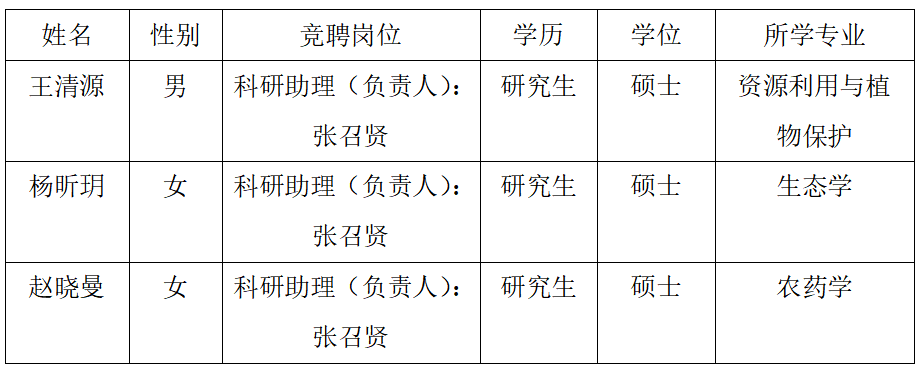 根据《安徽农业大学2025年科研助理招聘公告》的通知要求,按照公开招聘、资格审查、综合面试等相关工作程序,现将资源与环境学院2025年科研助理岗位招聘拟聘人选公示如下: