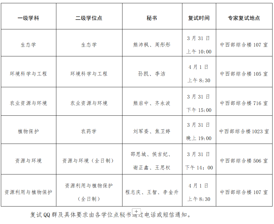 通 知 | 资源与环境学院2026年各学位点(第一志愿)硕士研究生复试安排