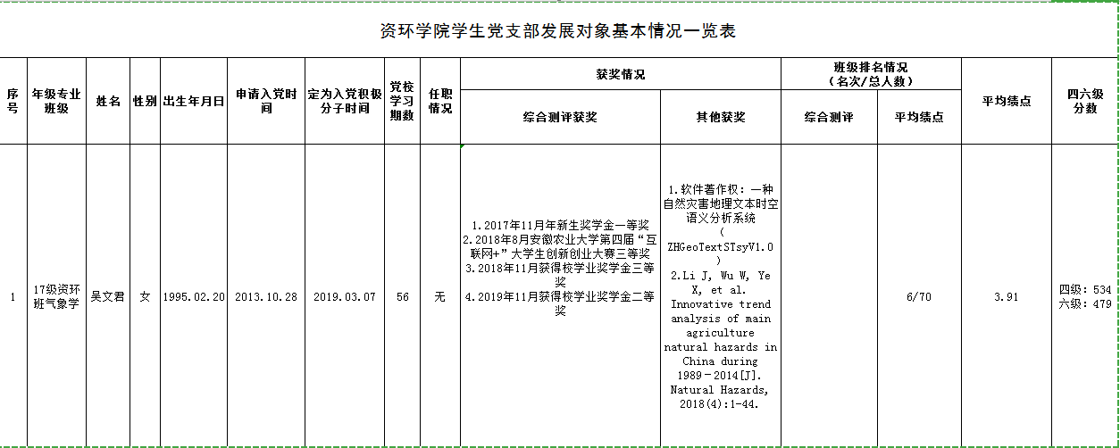 根据本人申请、组织培养和考察,经学院学生党支部支委会讨论,拟确定吴文君同学为建党对象,现将有关情况公示如下。在公示期内,欢迎广大党员、师生通过信函、电话或直接到党委反映公示对象的思想品质、现实表现、培养教育等方面的情况。公示无异议后,报学院党委会研究确定本期发展对象。