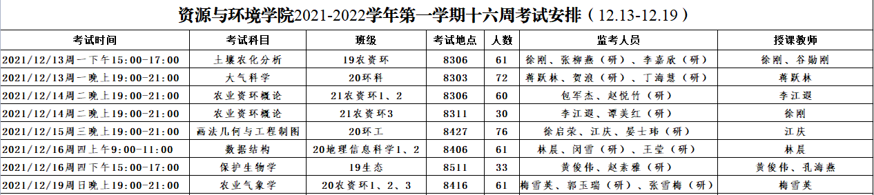 资源与环境学院2021-2022学年第一学期十六周考试安排