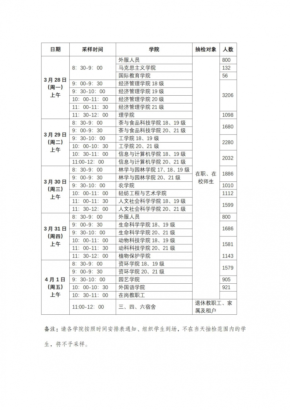四、抽检工作要求:为保质保量完成每天核酸抽检工作,请各学院严格按照学校抽检时间安排表通知、组织师生到场;