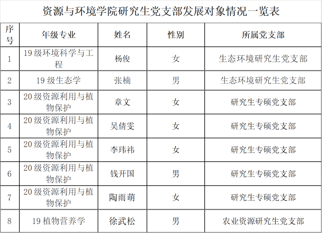 根据本人申请、组织培养和考察,经学院研究生党支部支委会讨论,拟确定杨俊等8位同学为建党对象,现将有关情况公示如下。在公示期内,欢迎广大党员、师生通过信函、电话或直接到党委反映公示对象的思想品质、现实表现、培养教育等方面的情况。公示无异议后,报学院党委会研究确定本期发展对象。