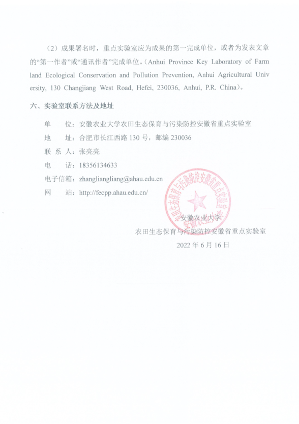 成果署名:(1)项目资助栏应注明“农田生态保育与污染防控安徽省重点实验室开放基金资助项目,项目编号:×××××”(The Open Fund of Anhui Province Key Laboratory of Farmland Ecological Conservation and Pollution Prevention,KLFECPP2022××××)。