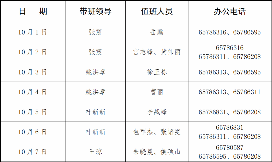 根据学校2022年国庆放假安排,在假期间,为确保各教研室、实验室、办公室的安全,做好疫情防控和防火、防盗等安全工作,学院特安排值班人员如下,要求值班人员认真履行职责,按时值班。