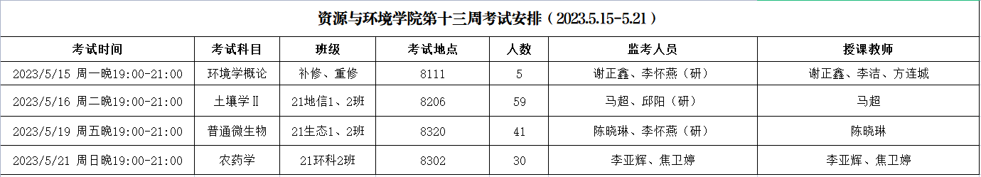 考试安排 | 资源与环境学院2022-2023-2第十三周考试安排