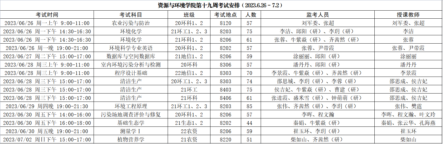 考试安排 | 资源与环境学院2022-2023-2第十九周考试安排