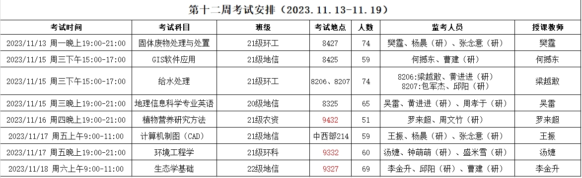 考试安排 | 资源与环境学院2023-2024-1第十二周考试安排