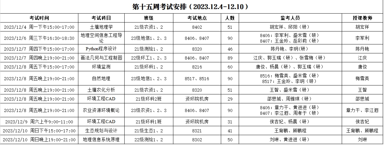 考试安排 | 资源与环境学院2023-2024-1第十五周考试安排