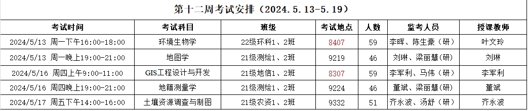 考试安排 | 资源与环境学院2023-2024-2第十二周考试安排
