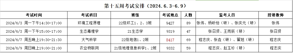 考试安排 | 资源与环境学院2023-2024-2第十五周考试安排
