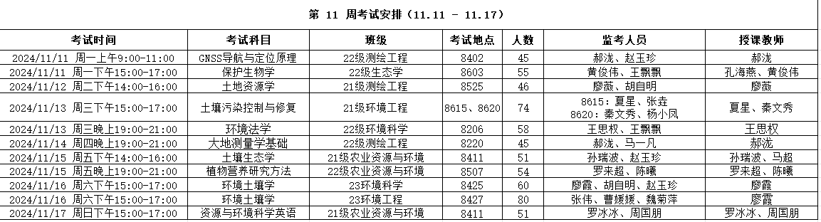 考试安排 | 资源与环境学院2024-2025-1 第十一周考试安排