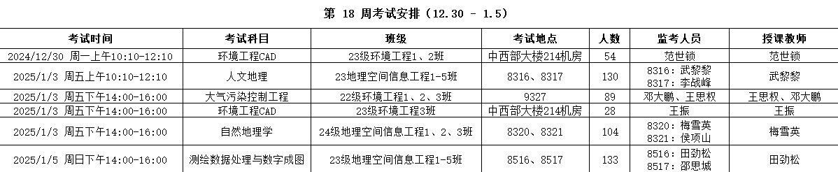 考试安排 | 资源与环境学院2024-2025-1 第十八周考试安排