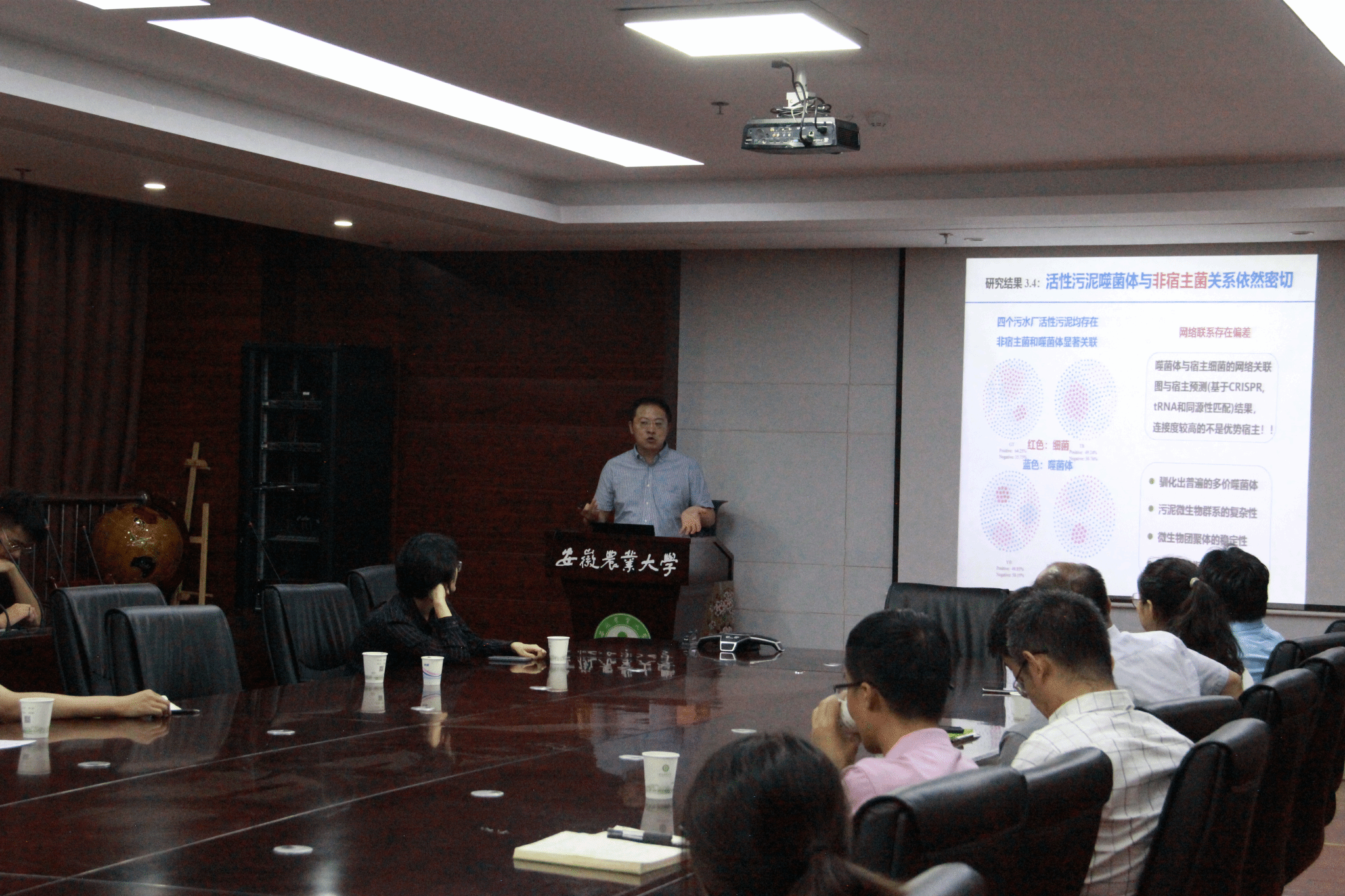 本网讯 9月14日下午,资源与环境学院于中西部综合楼南楼510会议室举行“绿洲”生态环境高峰论坛学术报告会,特邀南京农业大学资源与环境学院孙明明教授和中科院南京土壤研究所叶茂副研究员分别作题为“农药污染土壤病毒与宿主细菌互作机制研究”和“微生物絮体中病毒与宿主协同抵御水力胁迫的机制”的学术报告。学院60余名师生参加了报告会,会议由学院副院长叶新新教授主持。