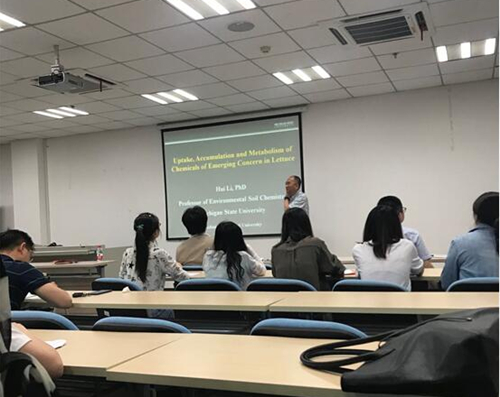 本网讯 为加强学术交流和学科建设,5月24日上午,应安徽省农产品质量安全重点实验室、资源与环境学院和安徽省农业生态环保与质量安全产业技术体系邀请,美国密歇根州立大学李晖博士来校进行学术交流和工作指导,并作题为“Uptake, Accumulation and Metabolism of Chemicals of Emerging Concern in Lettuce”的学术报告。院长郜红建主持报告会并对李晖来院开展学术交流和工作指导表示热烈欢迎。科技处处长花日茂教授、学院部分教师及农药学、环境科学、环境工程研究生、部分本科生参加了报告会。