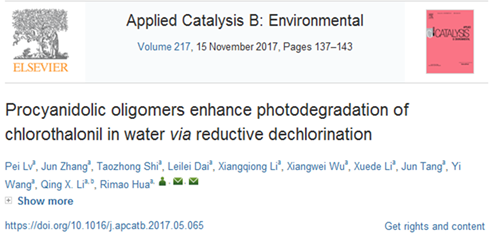 本网讯 近日,我院农药学科花日茂教授团队在国际高水平学术期刊Applied Catalysis B: Environmental(JCR 1区,影响因子IF 9.446)发表论文:“Procyanidolic oligomers enhance photodegradation of chlorothalonilin water via reductive dechlorination”(https://doi.org/10.1016/j.apcatb.2017.05.065)。团队主要研究方向之一是农药光化学降解,该论文研究内容是花日茂教授主持的国家自然科学基金项目。该文第一作者为农药学教研室青年教师吕培博士,花日茂教授为通讯作者,安徽农业大学为论文的第一及通讯单位。