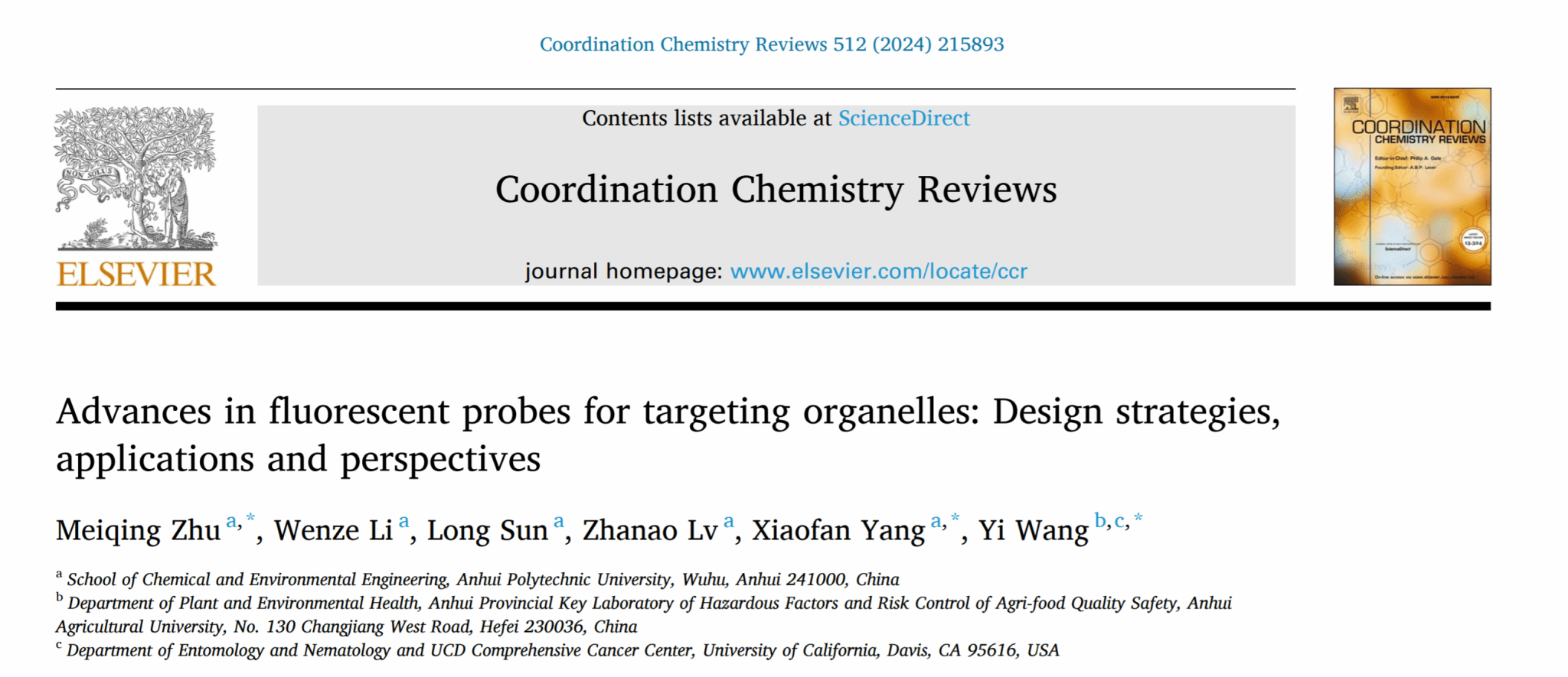 本网讯 近日,我校资源与环境学院王毅教授团队联合安徽工程大学杨晓凡副教授、朱美庆副教授团队在国际权威期刊《Coordination Chemistry Reviews》(IF=20.6,中科院一区TOP)发表题为“Advances in fluorescent probes for targeting organelles: Design strategies, applications and perspectives”的综述论文。《Coordination Chemistry Reviews》创刊于1966年,是目前化学学科权威性的综合性学术期刊之一,由爱思唯尔(Elsevier)出版。该刊重点刊登配位化学相关的金属有机化学、超分子化学、理论化学、生物无机化学、材料化学等领域重要的综述性论文。