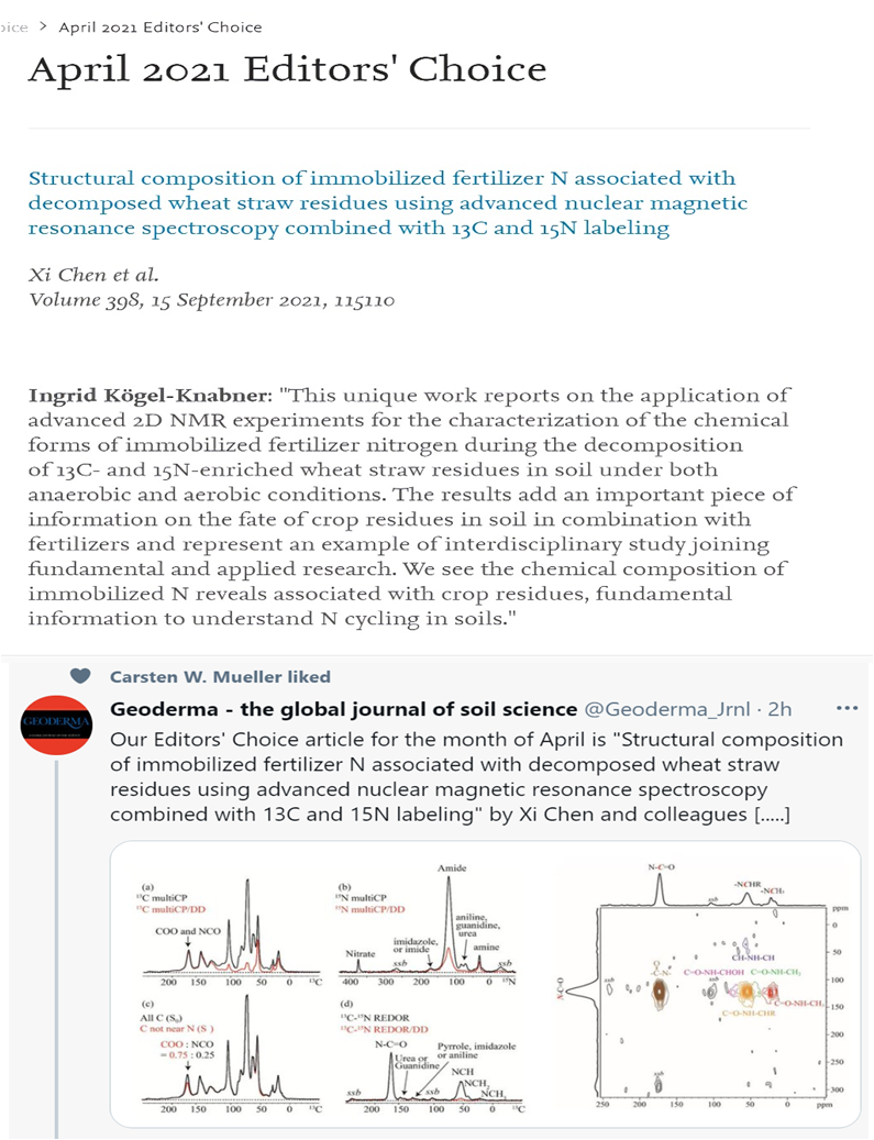 该论文被主审编辑,国际知名专家德国慕尼黑工业大学(Technique University of Munich, Germany)Ingrid Kögel-Knabner教授向Geoderma主编荷兰瓦赫宁根大学Jan Willem van Groenigen教授推荐评选为四月份编辑推荐论文。Ingrid Kögel-Knabner教授认为 “这一独特工作为解析土壤中还田秸秆与化肥之间的相互作用及氮素循环提供了十分重要的证据,是一个多学科交叉的基础和应用研究范例。”