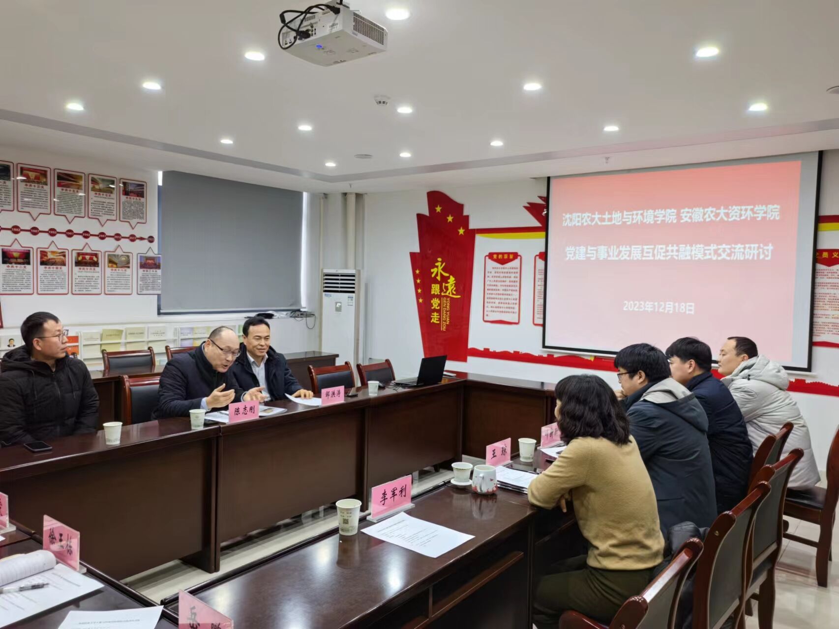 本网讯 12月18日下午,沈阳农业大学土地与环境学院党委书记陈志刚,院长邹洪涛率队来院调研交流。资源与环境学院党委书记王琼在中西部综合楼南楼503与来宾交流座谈。学院副院长叶新新、两办人员、教工党支部书记、学生党支部书记、系部主任参加座谈。