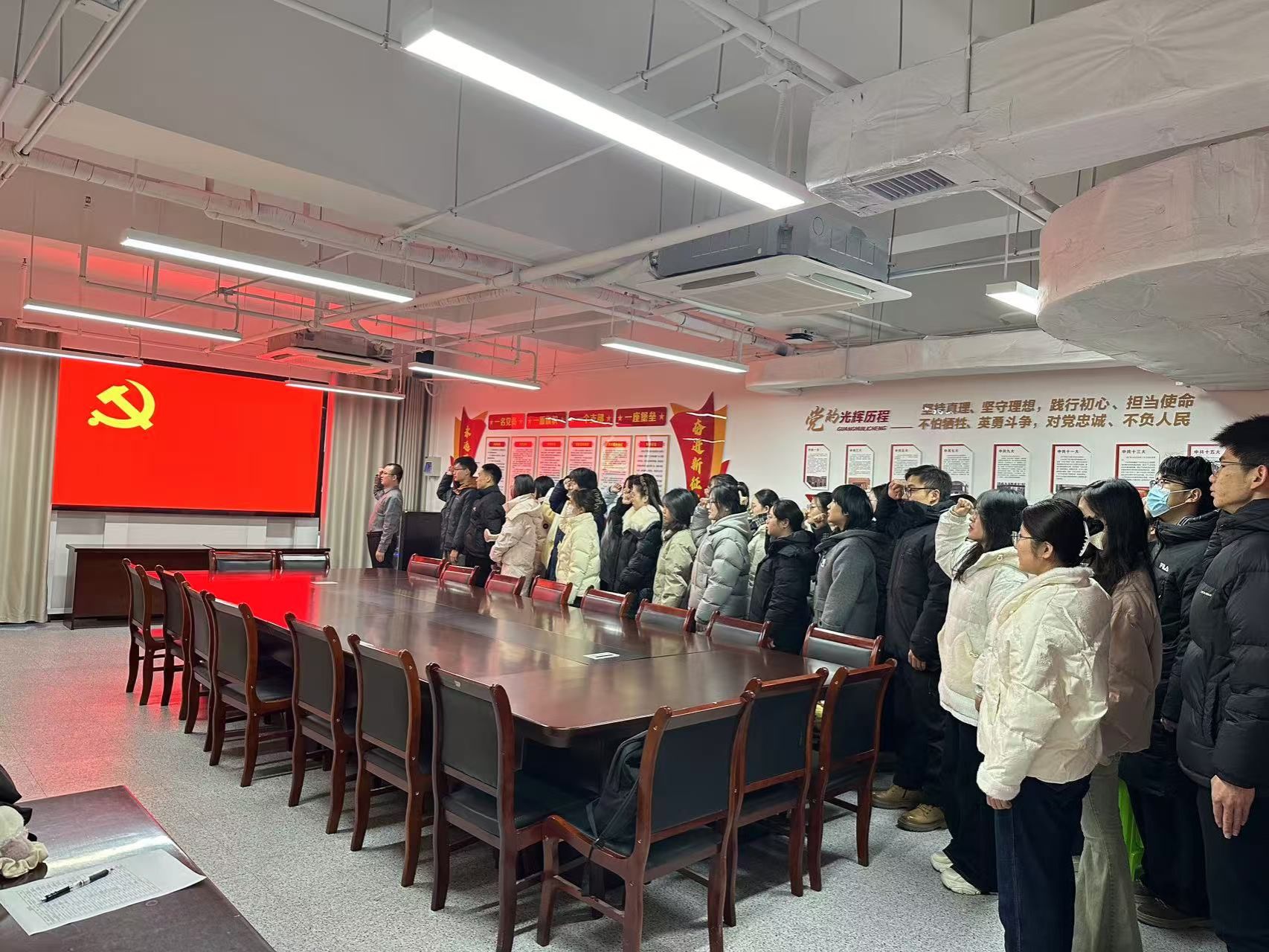 随后,在毛晓文的领誓下,全体预备党员面向党旗,高举右拳,郑重宣读入党誓词,铿锵有力的誓言回荡在会场中,表达了全体预备党员对党的忠诚和坚定的理想信念。