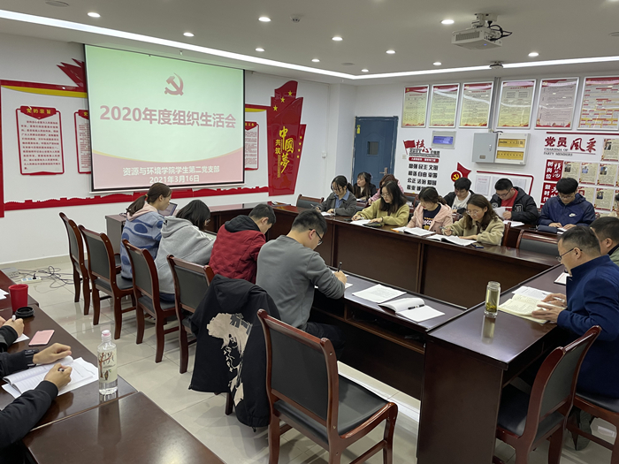 本网讯 3月16日下午,资源与环境学院学生第二党支部在中西部大楼503党员活动室召开2020年度组织生活会暨民主评议党员会议,会议由支部书记程玉峰主持,支部全体学生党员参加。