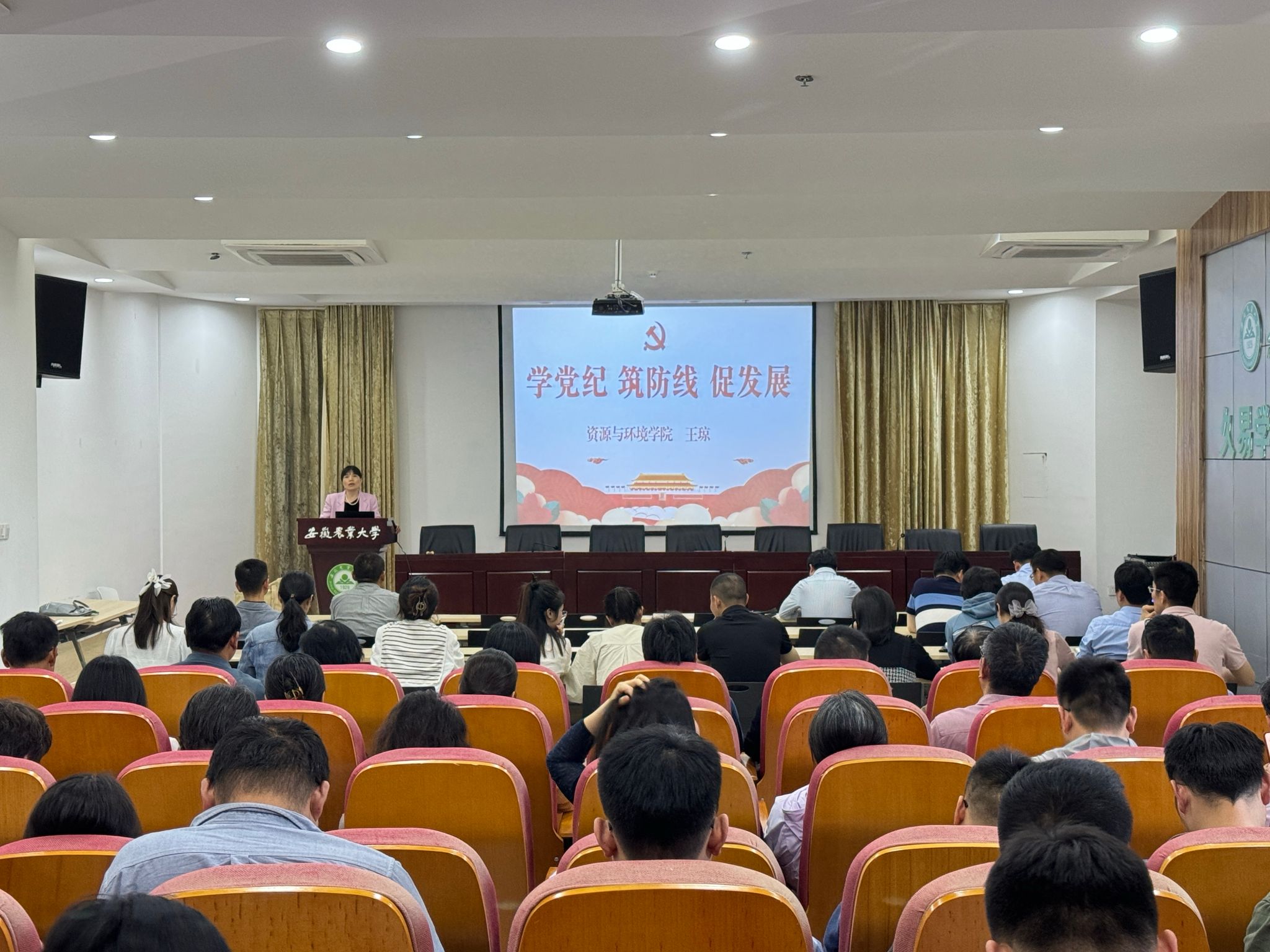 本网讯 为深入学习贯彻习近平总书记关于加强党的纪律建设的重要论述,教育引导教职工党员、干部学纪、知纪、明纪、守纪,推动学院全面从严治党向纵深发展,5月8日下午,资源与环境学院在中西部综合楼南楼久易报告厅召开教职工党员党纪学习教育专题学习会,学院党委书记王琼以“学党纪 筑防线 促发展”为题讲授专题党课。