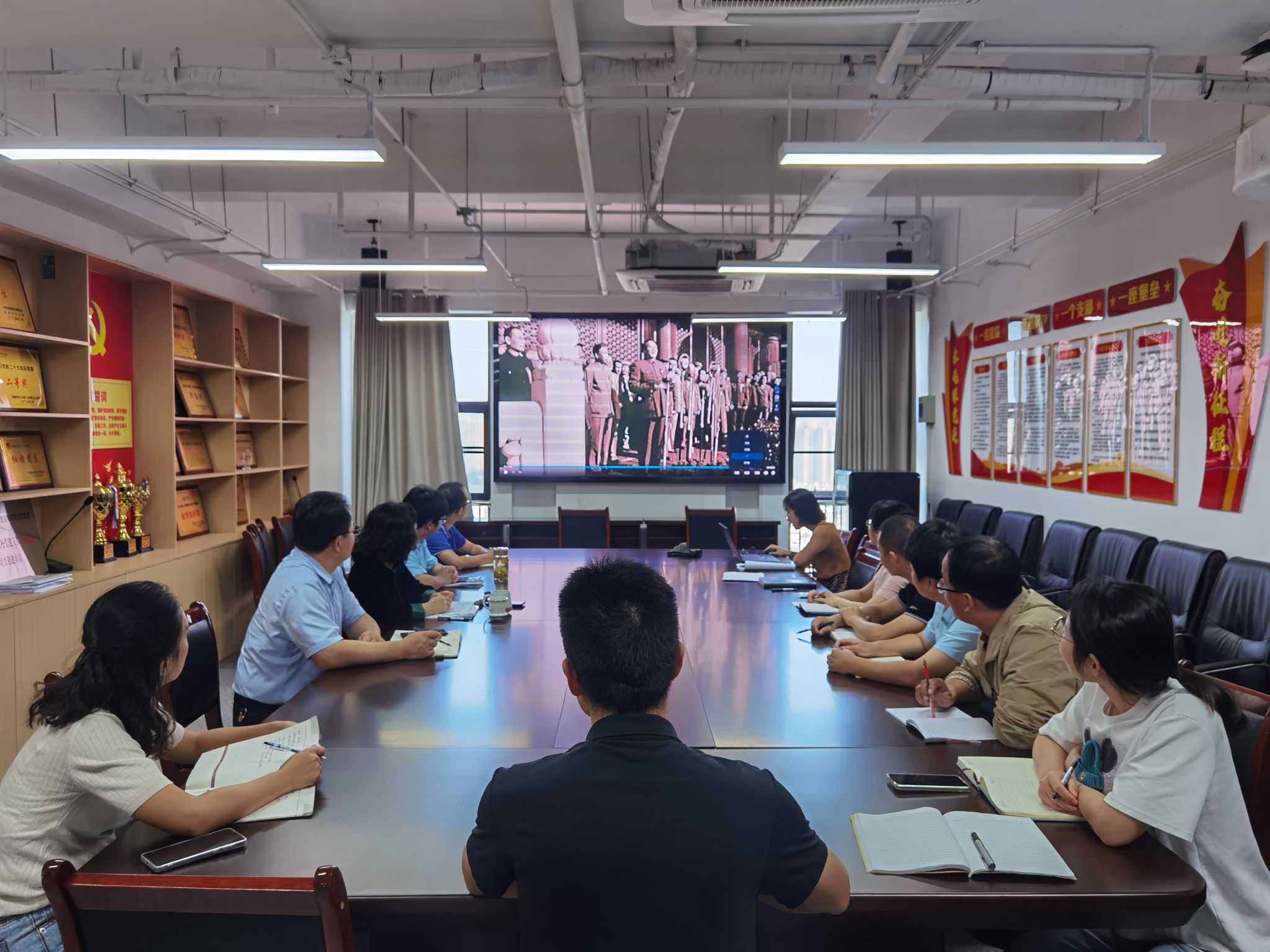 观影现场,气氛庄重而热烈。电影《开国大典》以宏大的历史视角,展现了从三大战役胜利到1949年10月1日在北京举行开国大典的历史过程。影片中,无数革命先烈为了国家的独立、民族的解放,抛头颅、洒热血,他们的英勇事迹和崇高精神深深打动了每一位党员干部,大家全神贯注,置身于那个激情燃烧的岁月。
