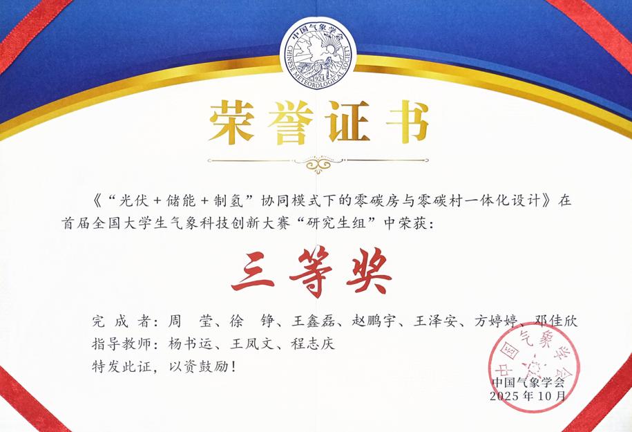 本网讯 首届全国大学生气象科技创新大赛在南京信息工程大学圆满落幕。学院杨书运、王凤文、程志庆老师指导团队提交的《“光伏 + 储能 + 制氢”协同模式下的零碳房与零碳村一体化设计》作品,经过项目路演、现场答辩等环节的激烈角逐,在研究生组中荣获全国三等奖。