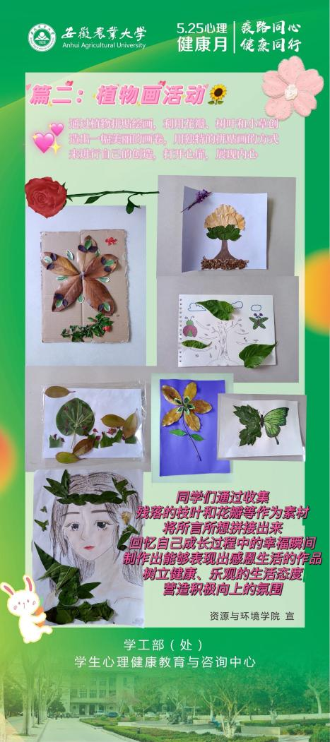 本网讯 5月中上旬,资源与环境学院举办了“525·我爱我”心理健康主题活动,本次活动主要由“流浪玫瑰”和“植物画”两部分组成。