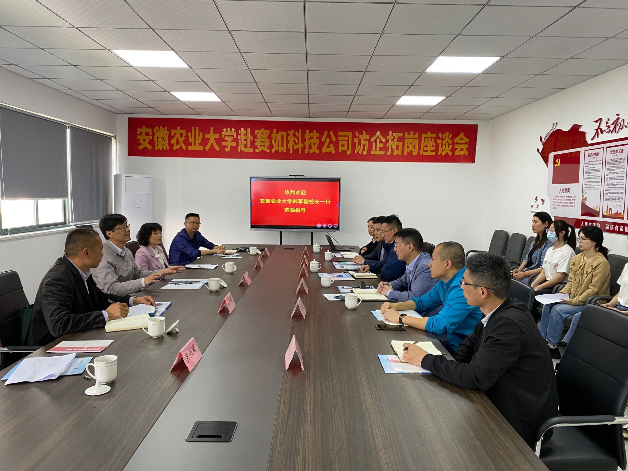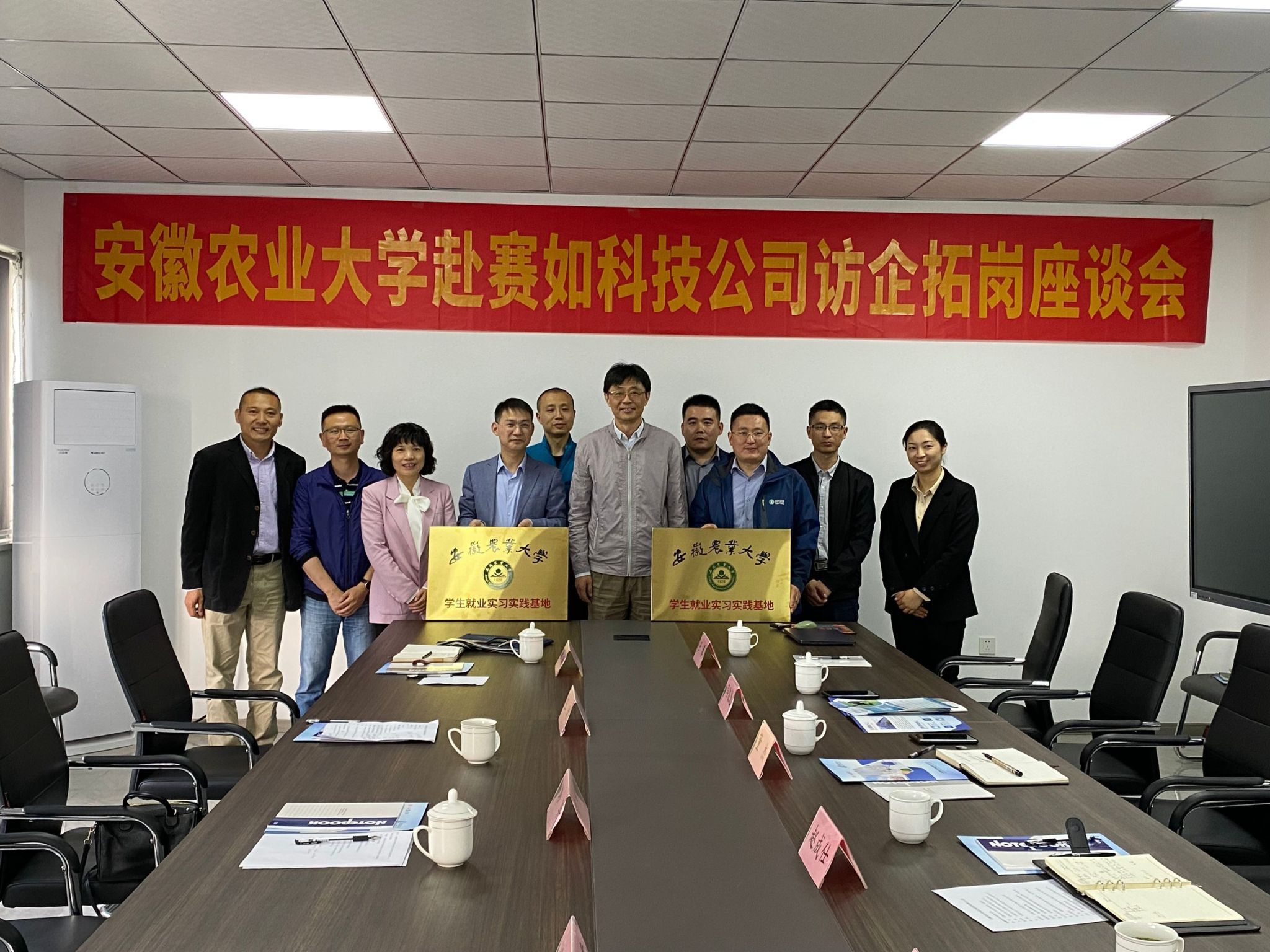 韩军对安徽泰科检测科技有限公司和安徽赛如分析检测科技有限公司长期以来对学校人才培养的支持表示感谢,并对校友企业近几年来取得的成绩表示祝贺。他指出,校企合作意义重大,今后要继续加强产教合作、校企合作,实现优势互补,进一步拓宽就业渠道,帮助学生实现高质量充分就业。他向安徽泰科检测科技有限公司和安徽赛如分析检测科技有限公司的校友表达了关心和慰问,感谢校友们长期以来对母校各项事业发展的支持与关注,希望校友们可以常回家看看。期间,韩军与程莹、董杰共同为安徽农业大学就业实习就业基地揭牌。