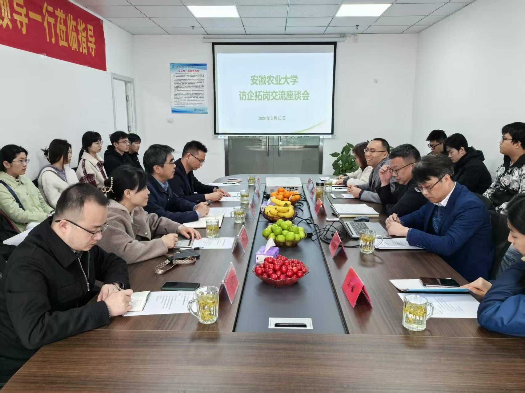 本网讯 3月28日上午,校党委常委、副校长蔡德军带队赴合肥环境谷园区开展访企拓岗并看望校友,资源与环境学院党委书记王琼、党委副书记毛晓文、副院长唐俊及学院2025届部分毕业生代表参加。安徽国众检测科技有限公司总经理我校2006届校友王文三、安徽华境资环科技有限公司负责人我校2003届校友于丽、安徽泰科检测科技有限公司副总经理我校2011届校友王馨参加活动。