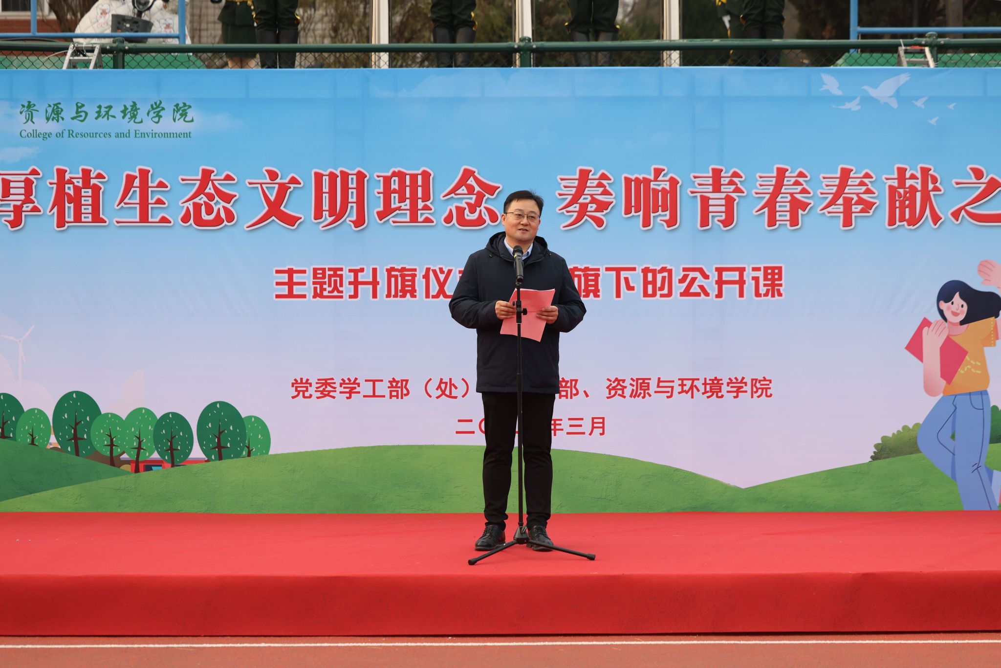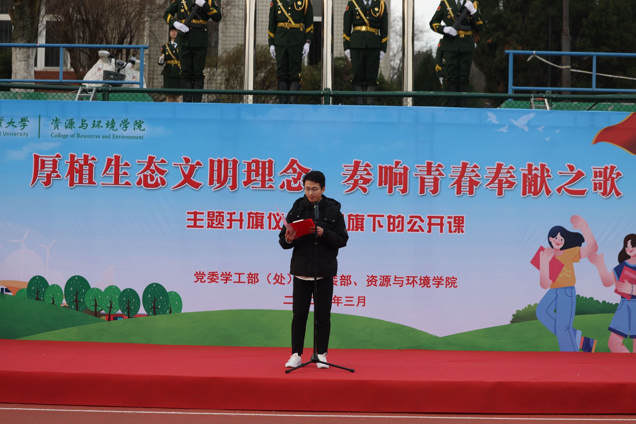 本网讯 3月11日清晨,由资源与环境学院承办的“厚植生态文明理念,奏响青春奉献之歌”主题升旗仪式暨国旗下的公开课在校第一运动场举行,学院党政领导、专兼职辅导员和全体学生参加了活动。