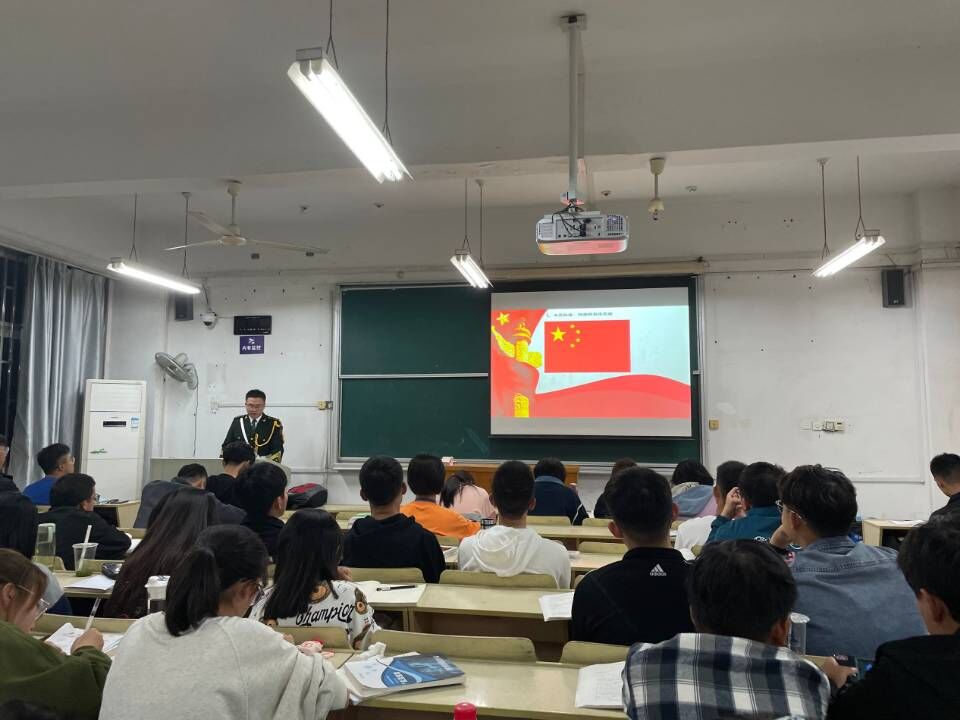 10月8-11月26日期间,每周三晚19点,经过精心准备,周子俊、黄彪两位同学身着国旗护卫队制服深入2021级新生班级解读国旗法、普及国防安全知识、讲述部队生活及亲身国护经历、宣传“热爱祖国,热爱国旗”思想,激扬主旋律,传播青春正能量,在场学生反响热烈。